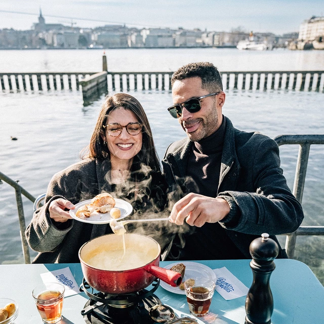 Fondue en mouvement, avec chocolats, champagne ou rose en option. Surprendre, version Genève.